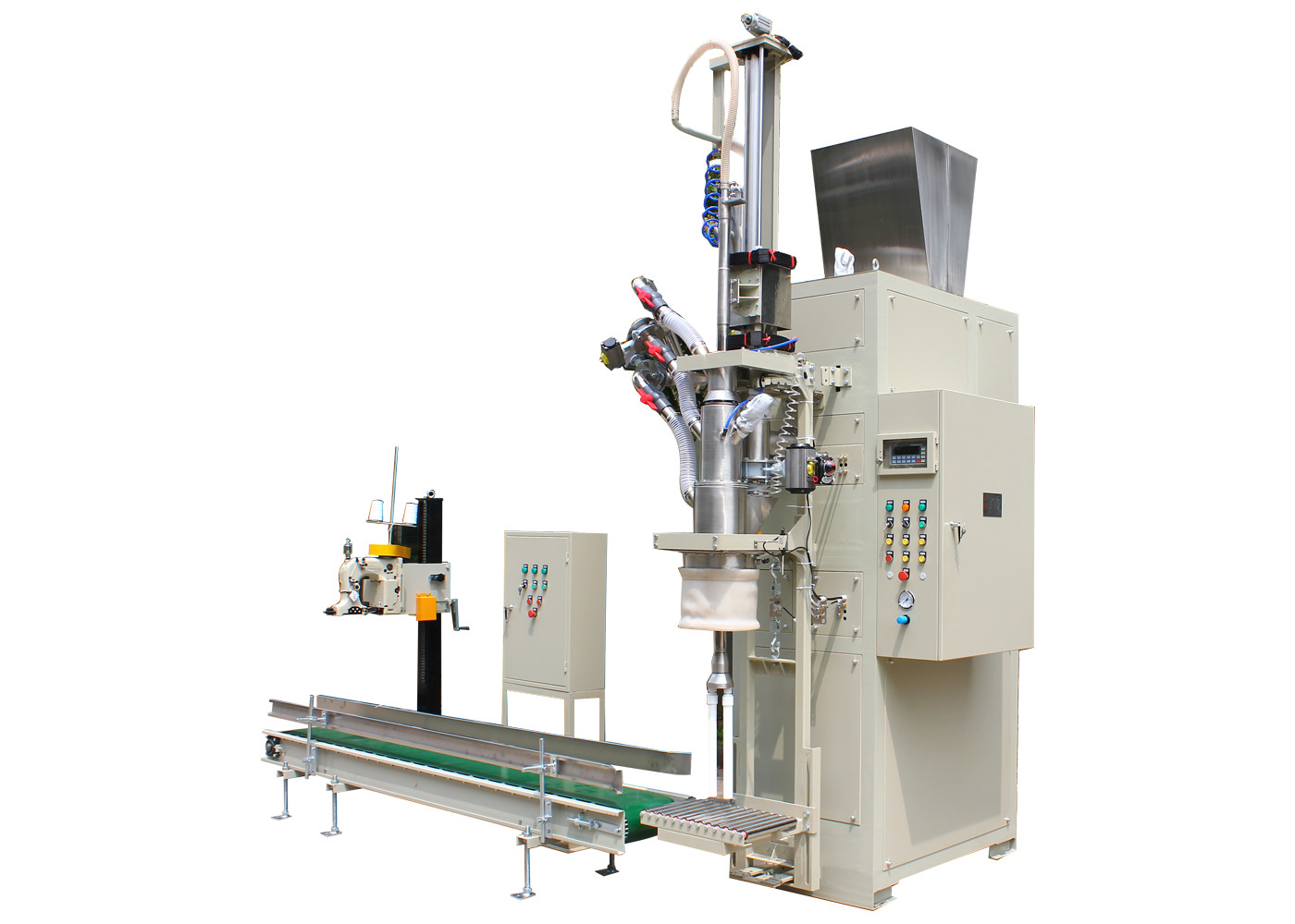 Электронный пакуя масштаб состоит из весить блок, швейную машину, конвейерное устройство, пневматическую систему, систему удаления пыли, количественный пакуя контроль, etc. весь веся процесс проконтролирован PLC и завершен автоматически.